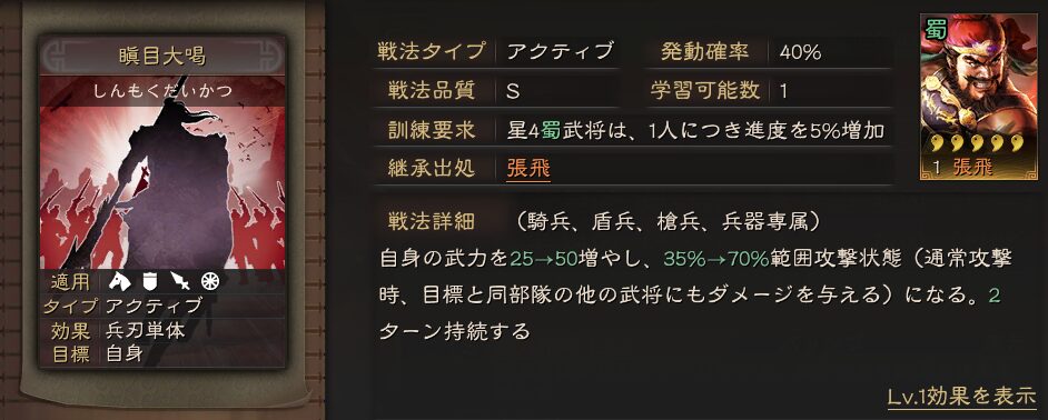 発動確率は自軍全体の知力の影響を受けるので知力型編制に適しています。