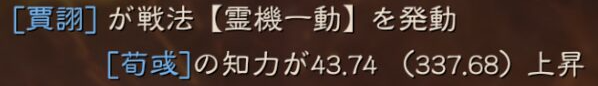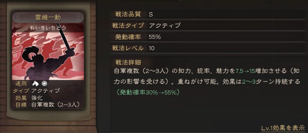 知力421.28で35.82統率が上がります。発動確率も高いので知力の高い周瑜と相性がよさそうです。