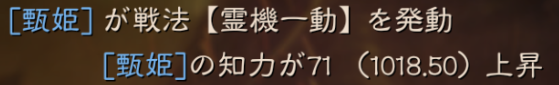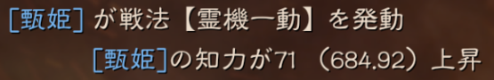 無双甄姫に昏迷乱擾と合わせて覚えさせて連発できれば知力1000以上も可能です。属性上昇値は71が最大で、おそらく知力600くらいで上限値に達します。