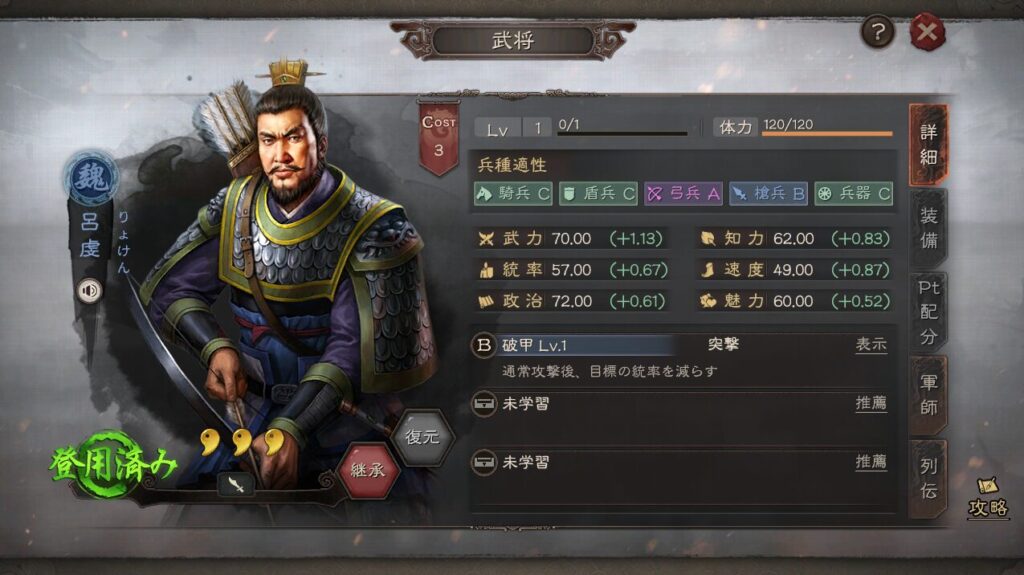 無双小喬の登場で、最新シーズンで呂布+無双小喬+郭嘉の編制で使用される事があります。発動確率が100%の突撃戦法は珍しく、無双小喬の固有戦法の発動のトリガーになるためです。破甲を入手するには呂虔から継承する必要があります。