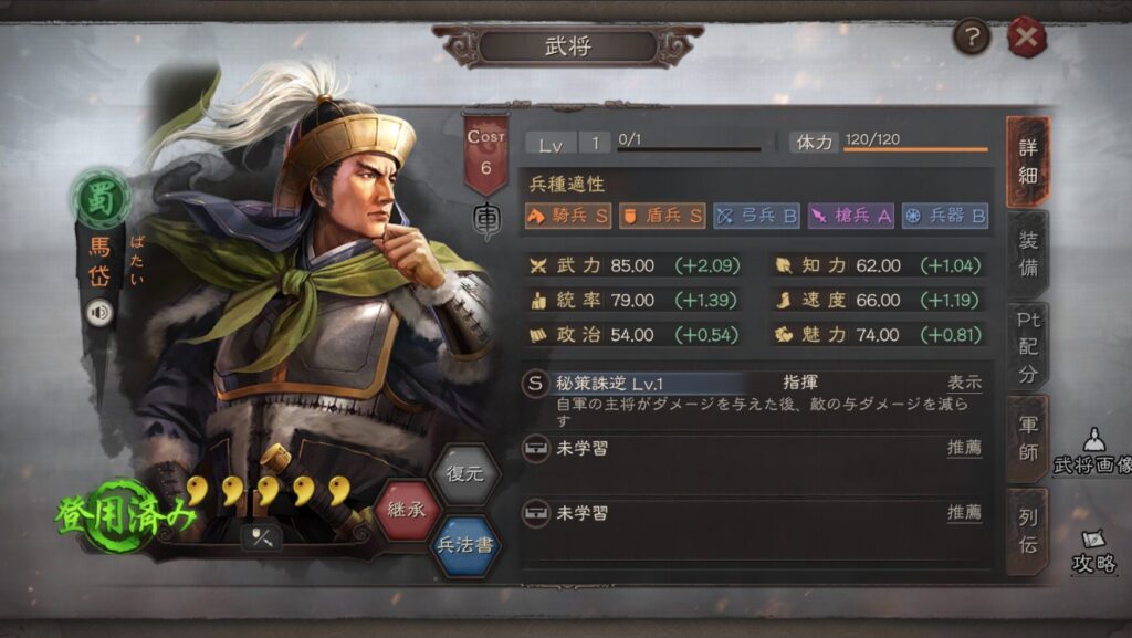 蜀勢力でコストは6、兵種適正は騎兵と盾兵がSです。