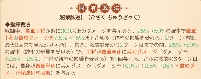 固有戦法は指揮戦法で主将依存のサポート&火力戦法です。6ターン目にダメージを与える効果は、主将がダメージを与えた回数が多ければ多いほどダメージが増えます。