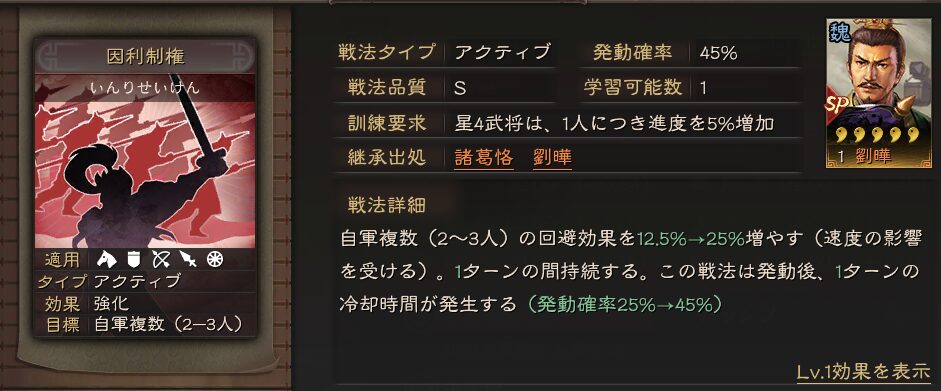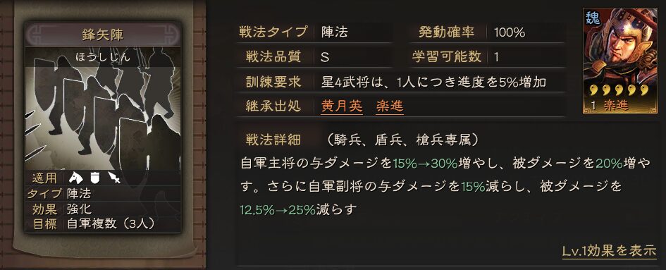中国では法官盾と呼ばれていて強い編制のようです。SP関羽には兵種宝物が必須です。魚鱗陣はSP法正から継承できる戦法で、蓄势待发はいずれ登場する事件戦法です。