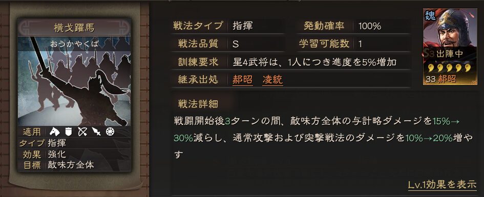 効果:戦闘開始から2ターンの間、自軍全体が必中を獲得+武力16増