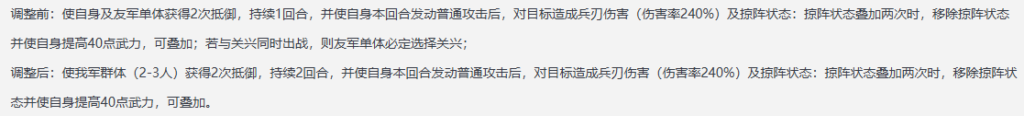 自身と友軍単体が2回の防御効果を獲得し、1ターンの間持続する。さらに自身が発動ターン中に通常攻撃を行うと、目標に兵刃ダメージを与え (ダメージ率120%→240%)、掠陣状態にする。 陣状態を付与した際、目標に掠陣状態をすでに2回付与している場合、目標の掠陣状態を解除し、さらに自身の武力を20→40増加させる(重ねがけ可能、戦闘終了まで継続する)。関興と同時に出陣している場合、友軍単体は必ず関興が選択される。