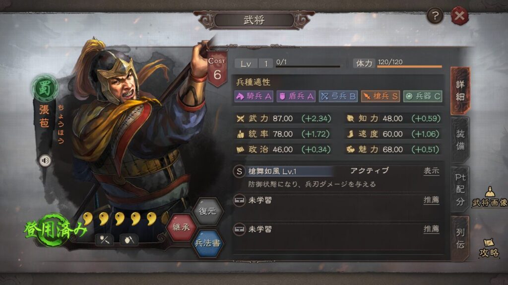 張苞と言えば北伐槍でしか使用される事がなく、使用したこともない人もいるのではないでしょうか。