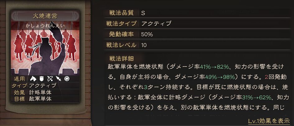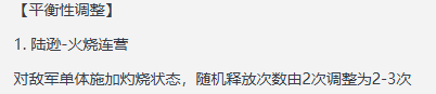 陸遜の固有戦法では敵軍単体を燃焼効果にする効果が2回発動しますが、この発動回数が2~3回発動に上方修正されました。3回発動する確率が50%なのかわかりませんが、確率次第では大幅な強化になりそうです。