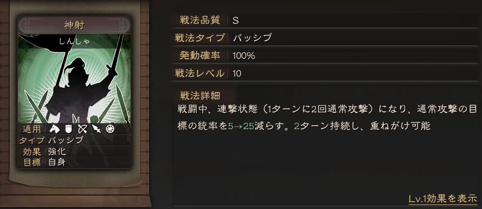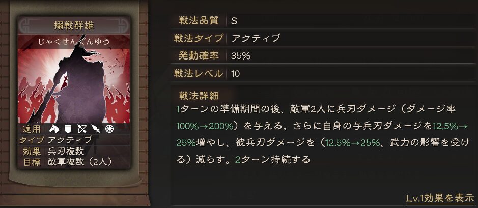 発動時に統率を25減らす効果がありますが、統率だけでなく武力も25減らす効果が追加されました。兵刃ダメージ系の相手と戦う場合は有利になるでしょう。