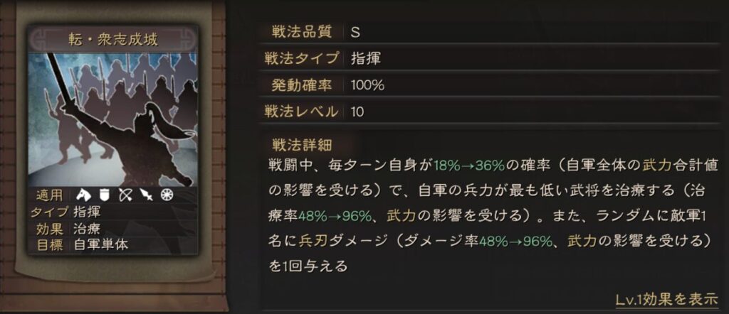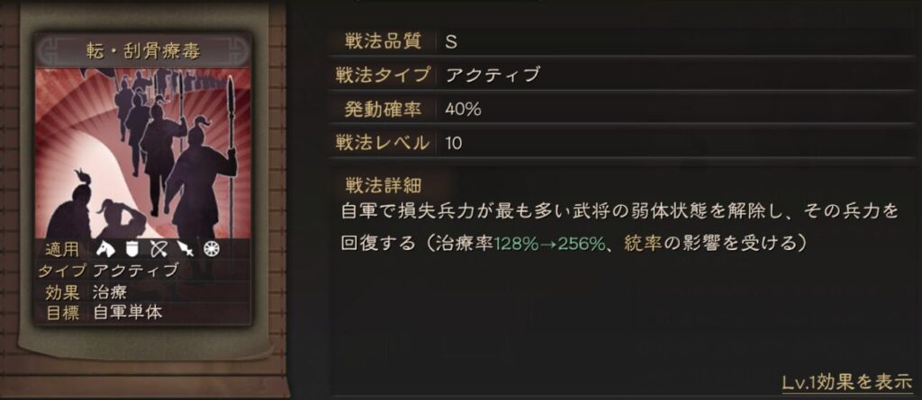 転・刮骨療毒と同じで統率が高いサポート武将全般に使えそうです。