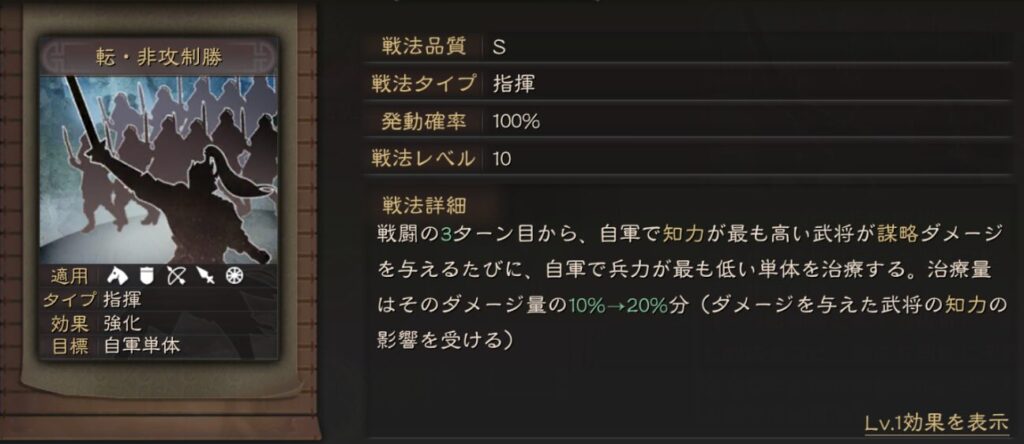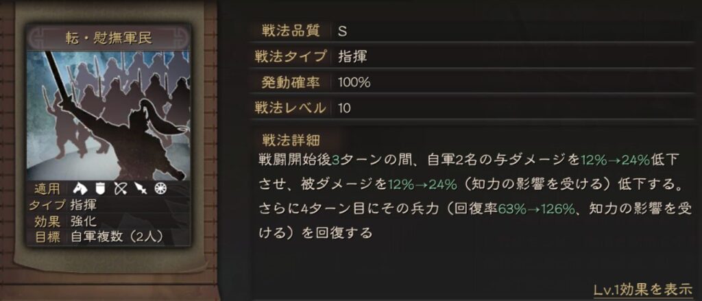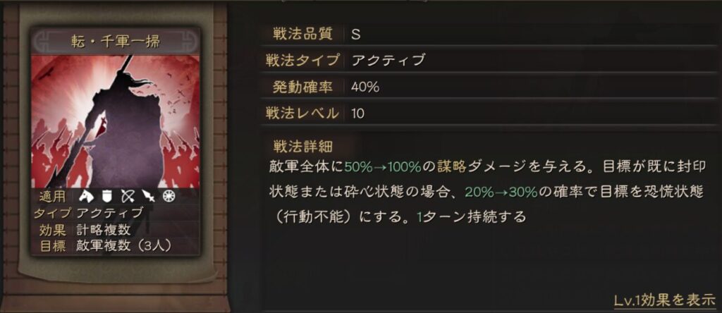過去のコピー戦法とは異なり、例えば昏迷乱擾の場合は知力依存ではなく武力依存に変更されています。なので今までなかったような編制も生まれる事になります。