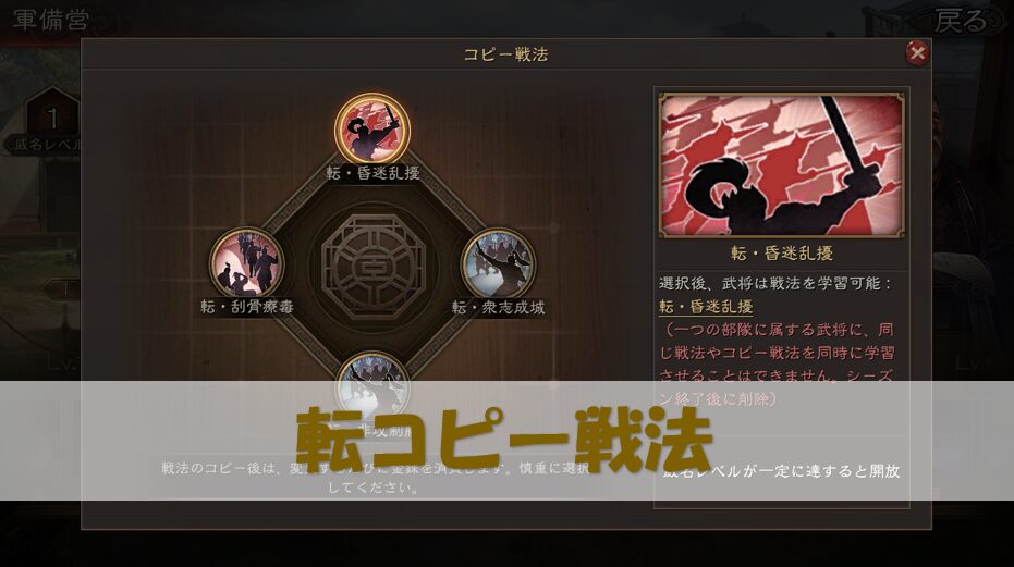 PKシーズン定軍山の戦いでは軍備営システムにより、コピー戦法を2つ習得する事ができます。