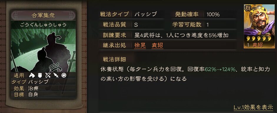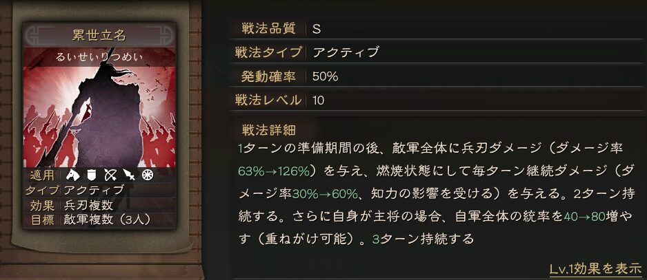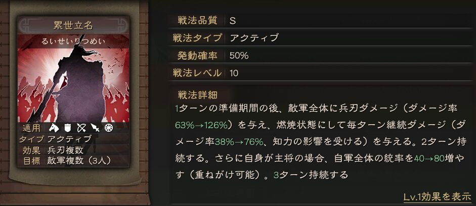 自身が主将の場合は、自軍全体の統率を最大80も増やし、効果も3ターン継続するので攻撃+防御の万能型戦法となっています。