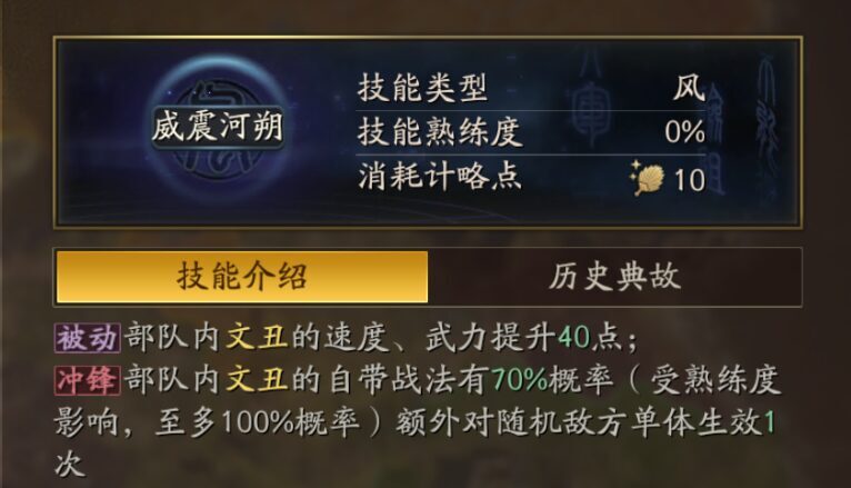 突撃:文醜の固有戦法は70%の確率で(熟練度の影響を受ける、最大100%)追加で1名に発動する。