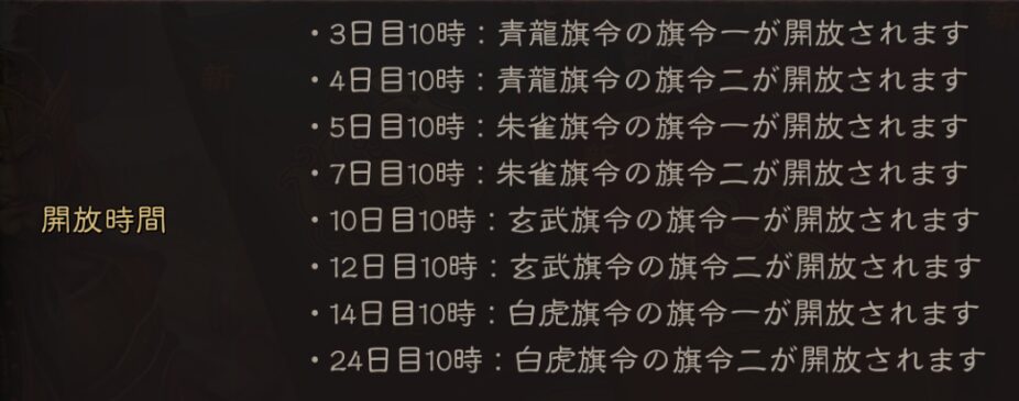 一番最後の白虎旗令二だけは開放時期が遅いですが、それ以外は1~2日おきに解放されます。どのような効果があるのか事前に確認しておきましょう。