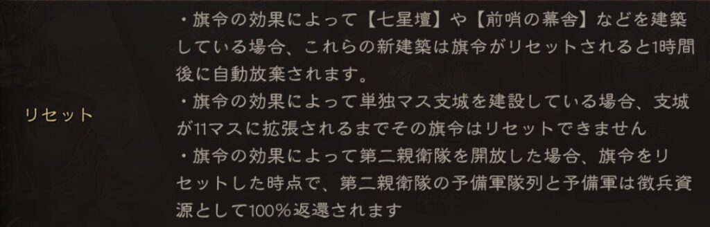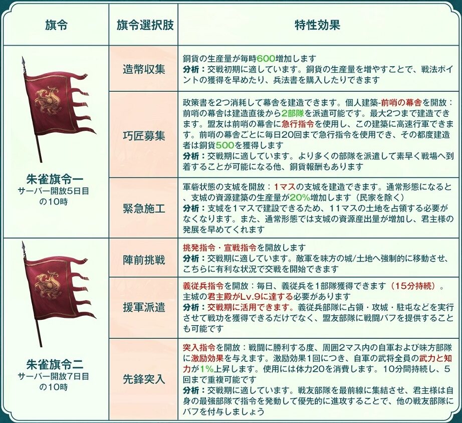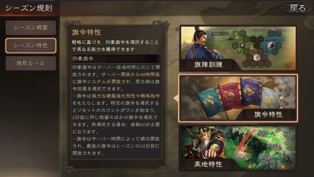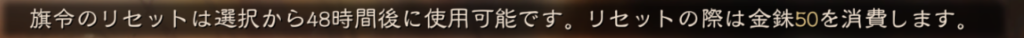 選んだ旗令は48時間経過すれば50金銖消費して変更する事は可能です。無駄な出費になる可能性もあるのでしっかり考えてから選択する必要があります。
