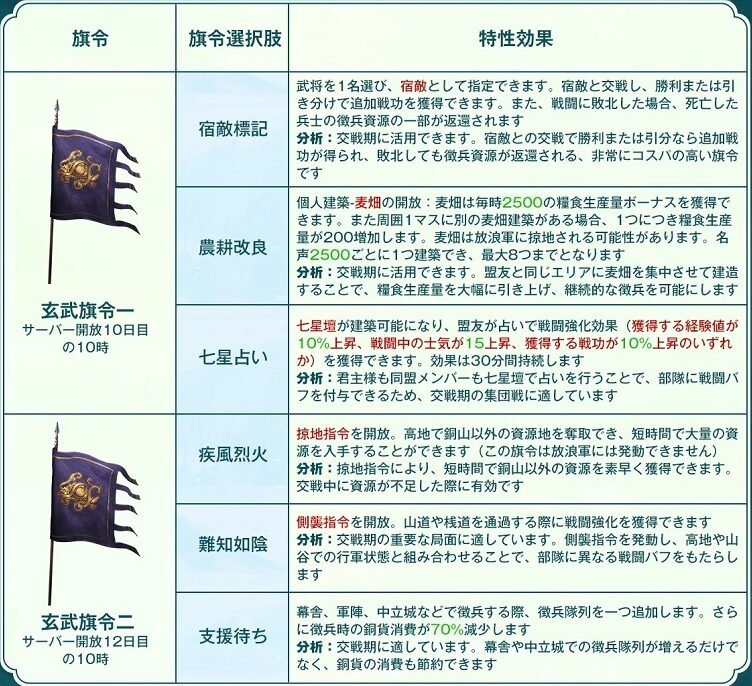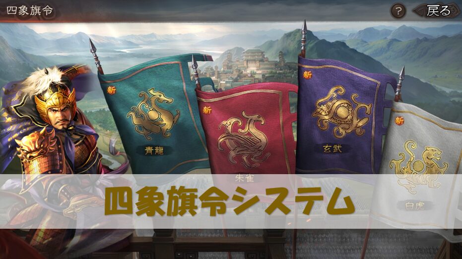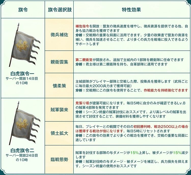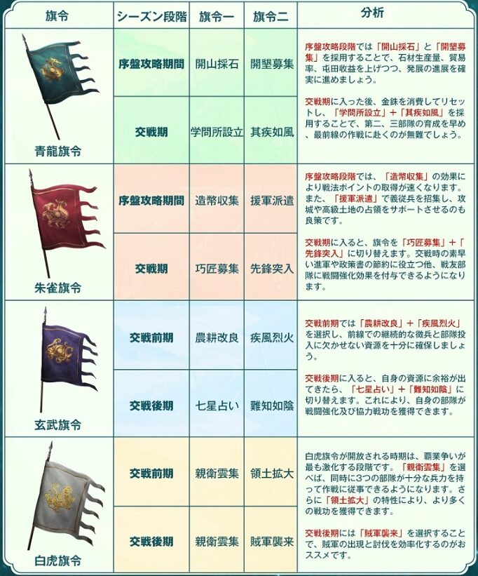 PKシーズン定軍山の戦いの特色システムで、旗令を選択する事で様々な効果を得る事ができます。青龍、朱雀、白虎、玄武の4つの旗令があり、それぞれ令一、令二があるので合計で8つの効果を選択する事になります。