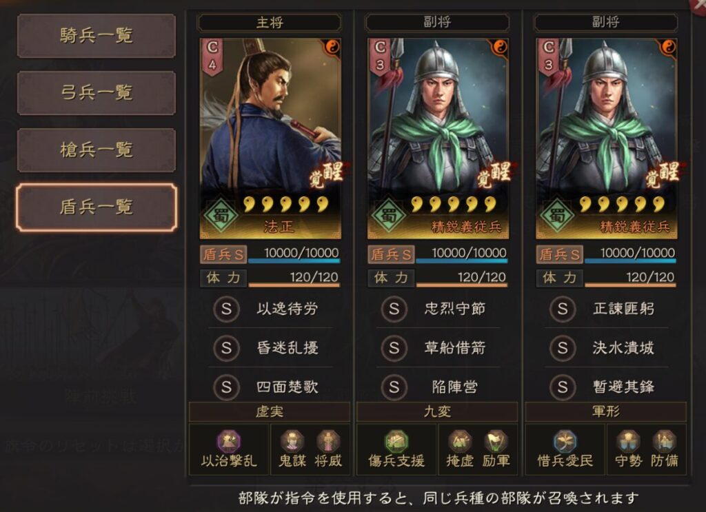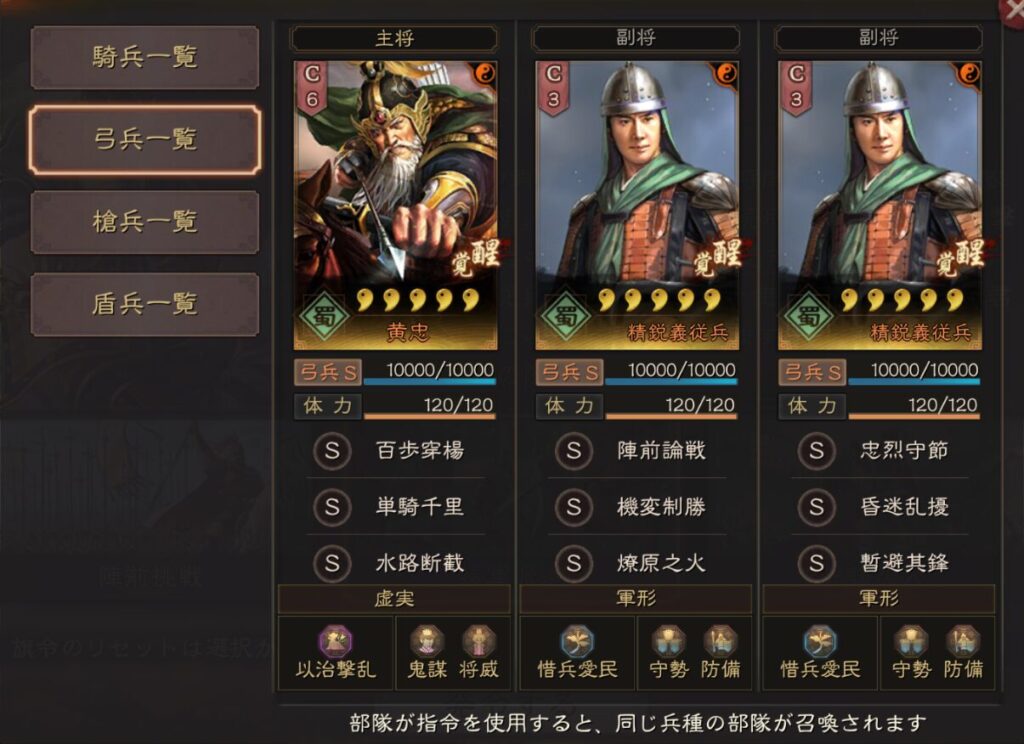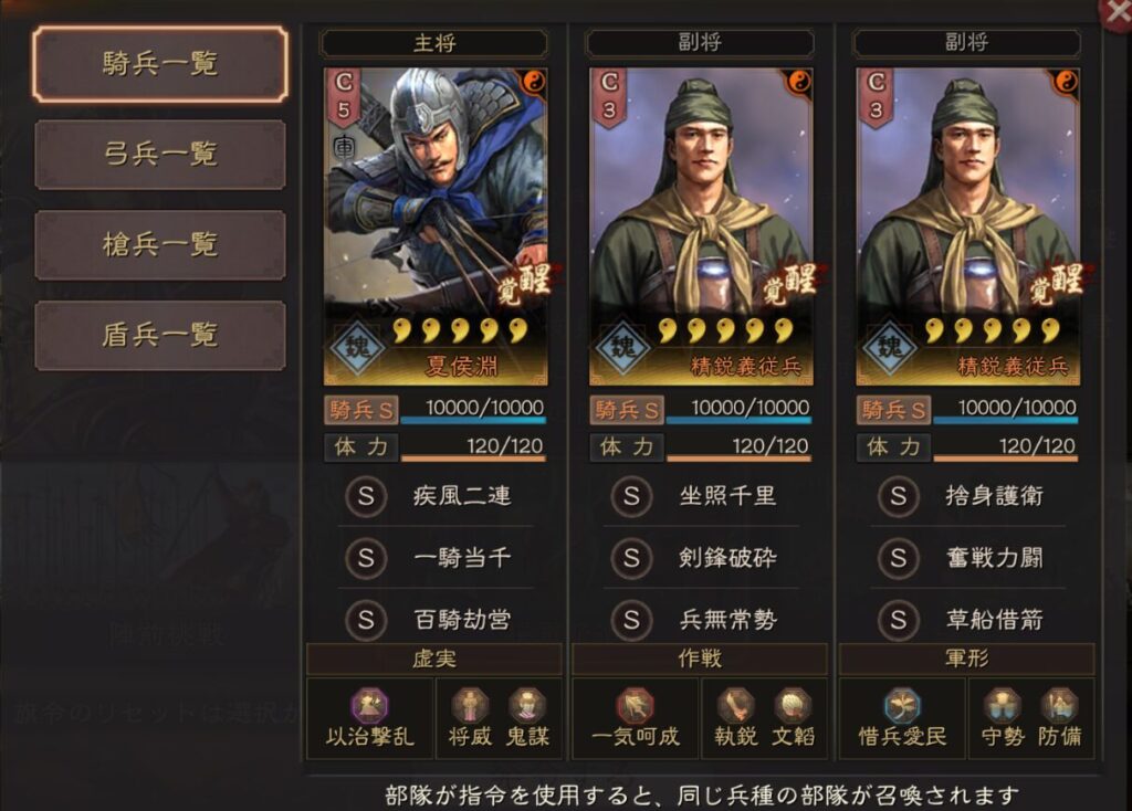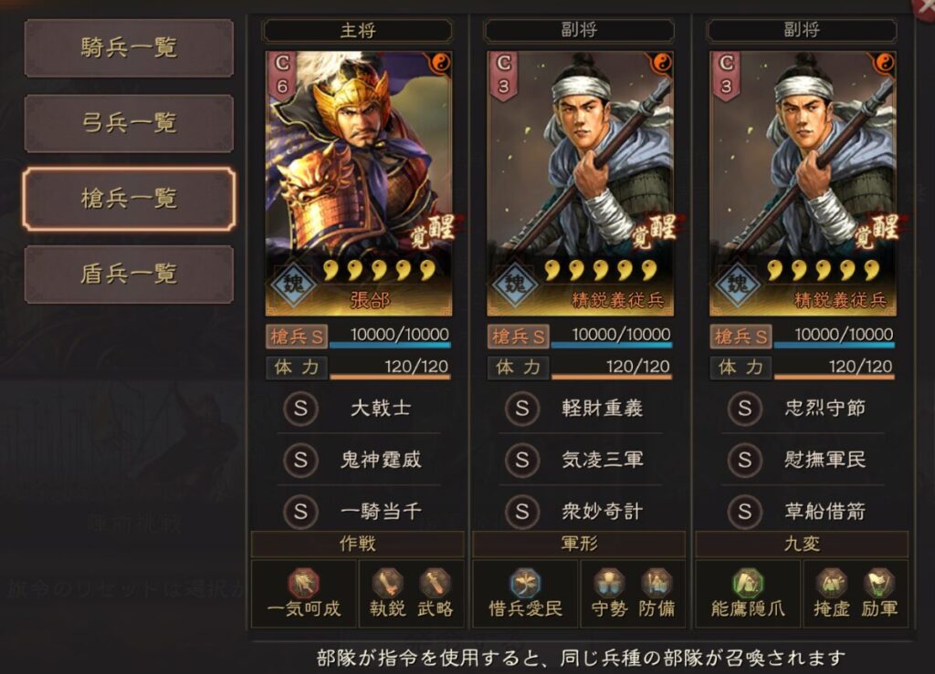 基本的には公式推薦のこの表通りに選択すればいいですが、青龍の其疾如風、朱雀の先鋒突入、玄武の七星占い、難知如陰は好みで変更してもいいと思います。