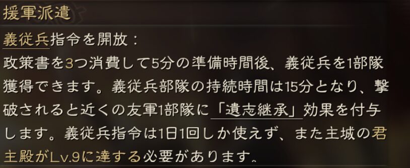政策書が3つ必要で、5分準備した後に15分間行動可能な義従兵を使えるようになります。
