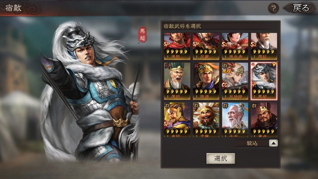 星5武将の中から宿敵を選べるようになります。戦場でよく見かけるSP馬超などを選ぶのがいいと思いますが、宿敵に当たらないと意味がないのでよく考えて選ぶ必要があります。
