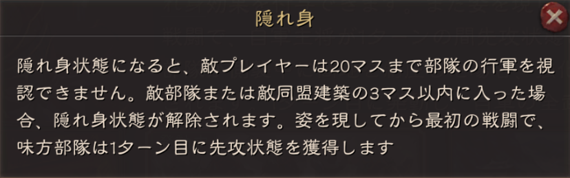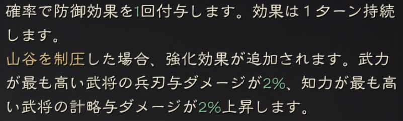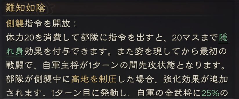 隠れ身状態が解除される、高地か山岳で戦闘を行った場合にバフ効果を得る事ができます。