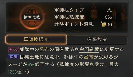 蓄勢:目的地に行軍させ、到着時に士気を25回復させる。到着時に周囲1マス以内に友軍がいない場合、さらに士気を20回復し(熟練度の影響を受ける、最大40)部隊全員の武力が20増加する。15分持続する。