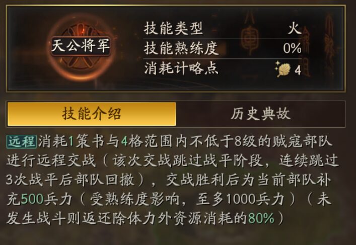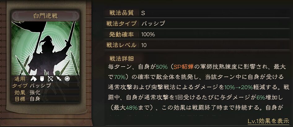 兵法:3マスの範囲内の敵は、自軍と戦闘することを選択できる。この戦闘は最大 3回連続で引き分けになる可能性があり、兵种克制?や九宮八卦効果は無視される。戦闘終了時に、こちらは追加で10%戦功(熟練度の影響を受ける、最大で20%)獲得し、敵は5%戦功を獲得する。10分間持続する(戦闘が発生しなかった場合は体力以外の資源が80%返還される)