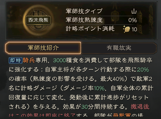 兵法: 自分の他の部隊を1つ選択し、30分後(熟練度の影響で最低15分)に、現在の部隊と選択した部隊が位置と士気を交換します(発動に失敗した場合、体力以外の消費資源の80%が返還される)
