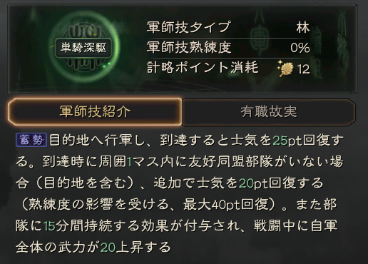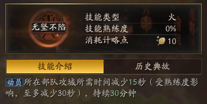 動員:所属部隊の攻城に必要な時間を15秒短縮する(熟練度の影響を受け、最大30秒まで短縮可能)。30分間持続する