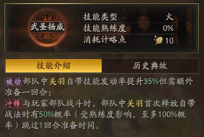 パッシブ: 部隊に関羽がいる場合、固有スキルの発動率が35%上昇するが、追加で1ターンの準備期間が必要。