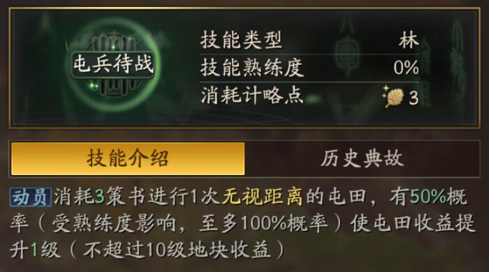 動員: 政策書を3つ消費して、距離を無視した屯田を1回実行する。50%の確率(熟練度の影響を受け、最大100%の確率)で屯田の収益を1レベル上昇させる(レベル10の土地の収益を超えない)。