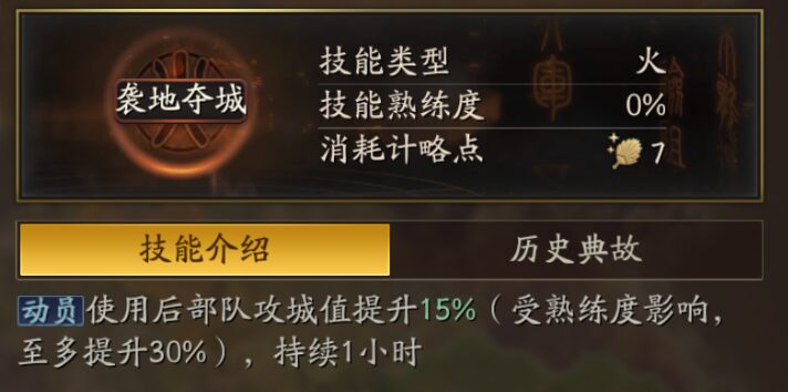 動員:部隊の攻城値が15%上昇(熟練度の影響を受け、最大30%)。1時間持続する。