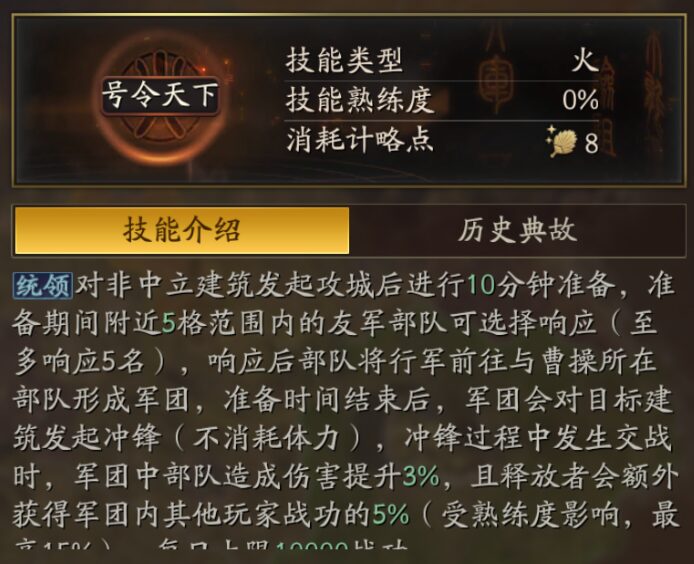 中立以外の建築物に攻城を開始すると10分間の準備に入る。準備中、周囲5マス以内の友軍部隊(最大5部隊まで)は「応援」を選択できる。応援した部隊は行軍し曹操の部隊と合流して軍団を形成する。準備時間が終了すると、軍団は目標の建築物に対して突撃を行う(体力は消費しない)。突撃中に戦闘が発生した場合、軍団内の部隊が与えるダメージが3%上昇する。さらに、この戦法の発動者は軍団内の他プレイヤーが獲得した戦功の5%を追加で獲得する(熟練度の影響を受け、最大15%まで)。1日の戦功獲得上限は10,000。