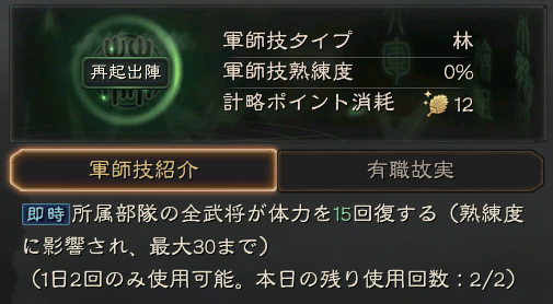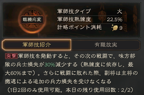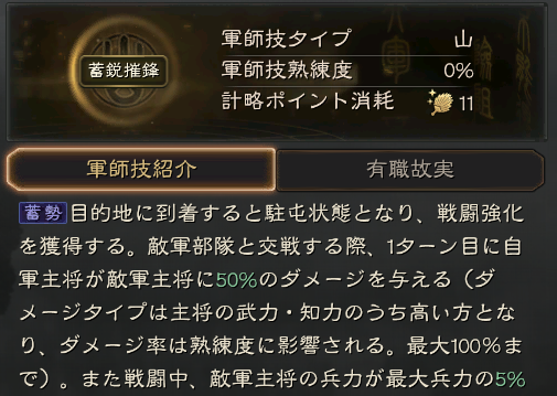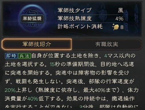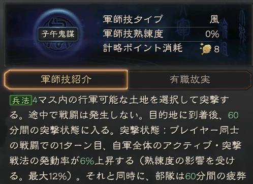 兵法: 自分の他の部隊を1つ選択し、30分後(熟練度の影響で最低15分)に、現在の部隊と選択した部隊が位置と士気を交換します(発動に失敗した場合、体力以外の消費資源の80%が返還される)