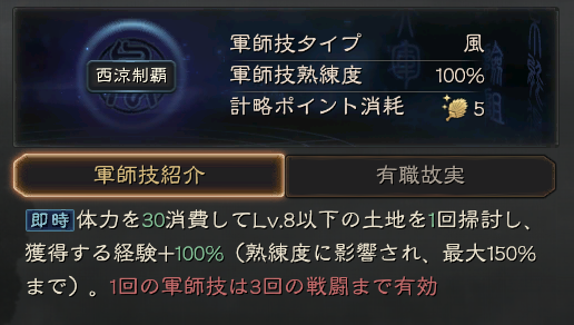 | S | 馬超 | 西涼制覇 | 風 | 5 | 掃討により追加分の経験値を獲得 |