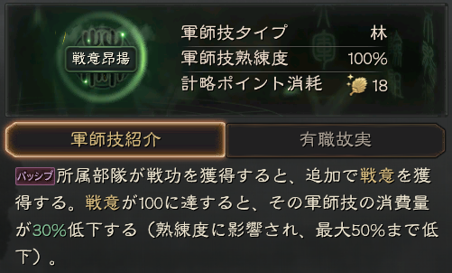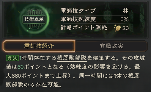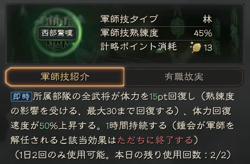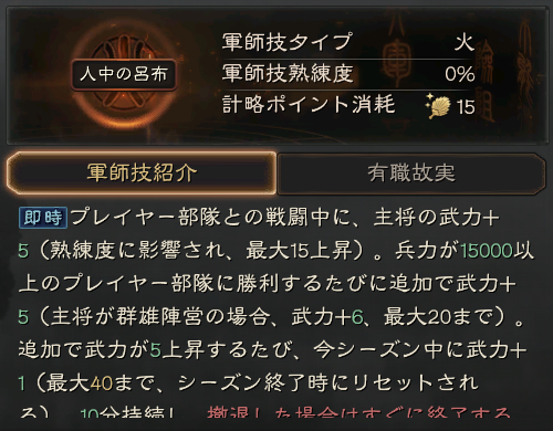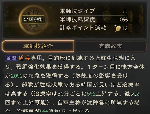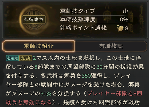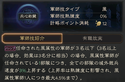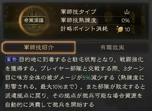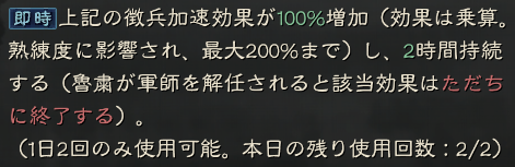 動員:所属部隊の攻城に必要な時間を15秒短縮する(熟練度の影響を受け、最大30秒まで短縮可能)。30分間持続する