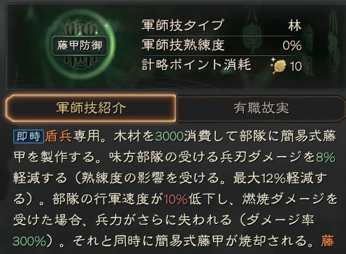 | C | 兀突骨 | 藤甲防御 | 林 | 10 | 盾兵専用、部隊に簡易式藤甲を製作 |