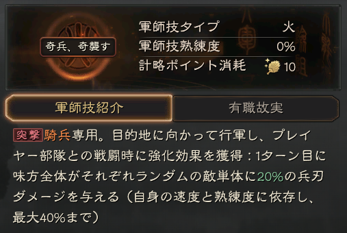| D | 李傕 | 兵兵、奇襲す | 火 | 10 | 行軍を開始し戦闘強化効果を獲得 |
