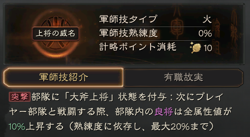 | D | 潘鳳 | 上将の威名 | 火 | 10 | 部隊内の良将の属性を大幅上昇 |