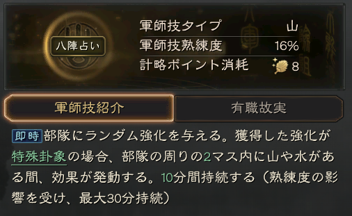 | C | 左慈 | 八陣占い | 山 | 8 | 部隊にランダム強化を付与可能 |