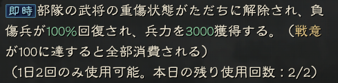 兵を補充するには徴兵か三軍褒賞で補充するくらいしかありませんでしたが、これを使用すれば即座に6000兵を補充する事ができます。