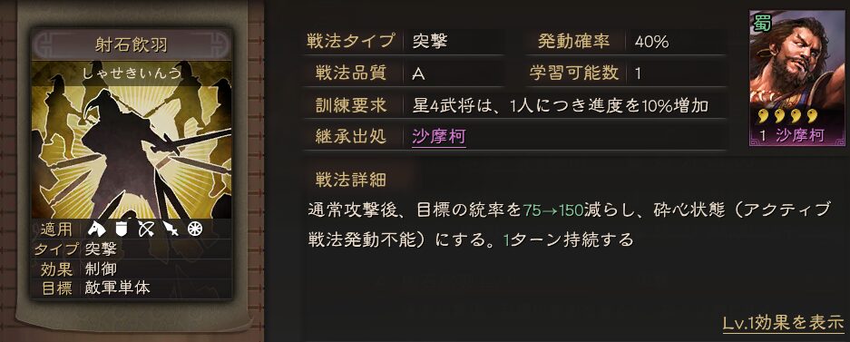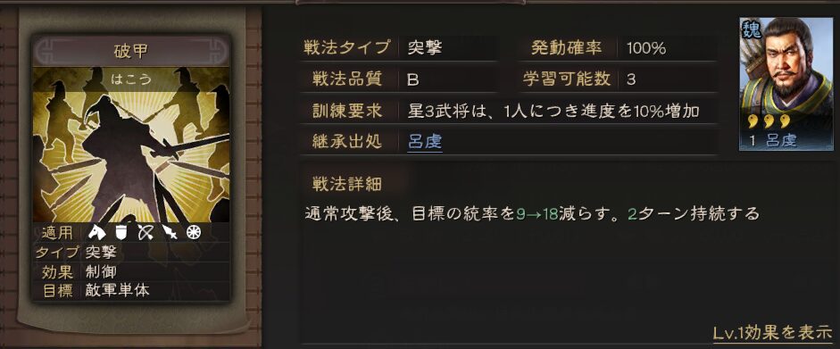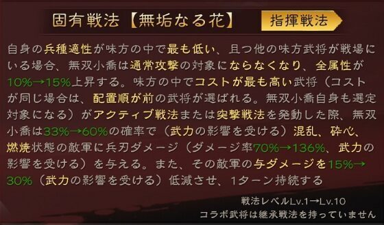 他にも突撃戦法はありますが、砕心にできる速乗其利は発動確率35%、混乱にできる暴戻恣睢も35%しかありません。突撃戦法は発動確率が35~45%のものばかりで、破甲の100%は破格の数値になっています。他の突撃戦法でダメな理由は、破甲で100%突撃戦法を発動させ、無双小喬の固有の発動機会を増やした方が圧倒的にダメージが出るからです。