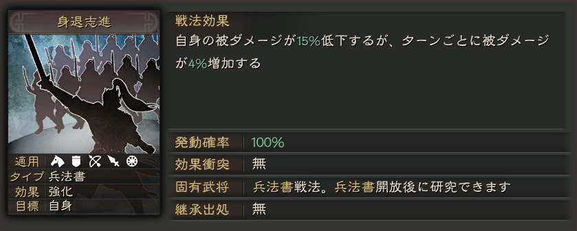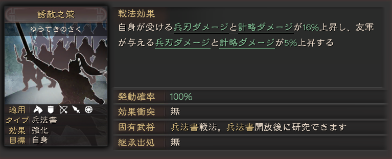 また、軍師技で固有戦法の発動確率を20%も上げることができるので、上手く活用すれば戦功もたくさん稼ぐ事ができます。