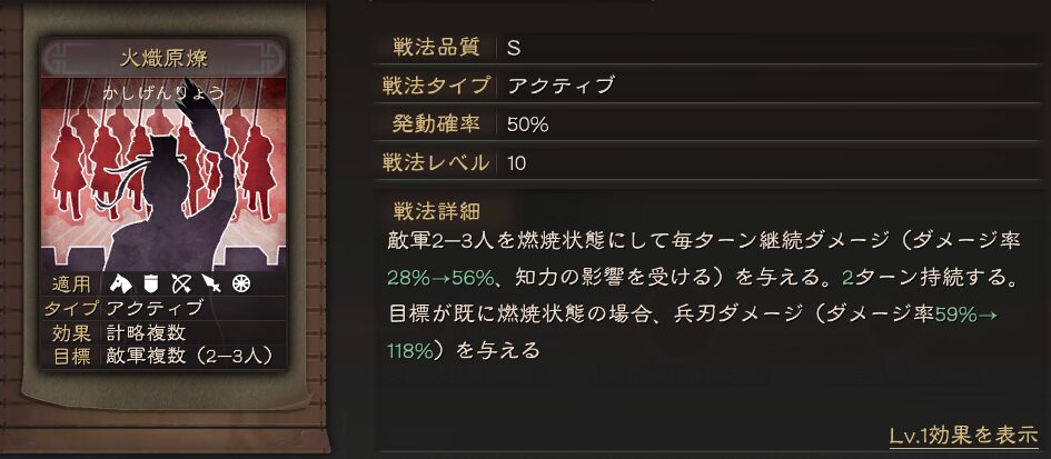 無双小喬の固有戦法を発動させるには、呂布の射石飲羽だけでは不十分で、発動確率が高く敵複数を燃焼状態にでき、2ターン持続する火熾原燎は非常に相性がいい戦法です。