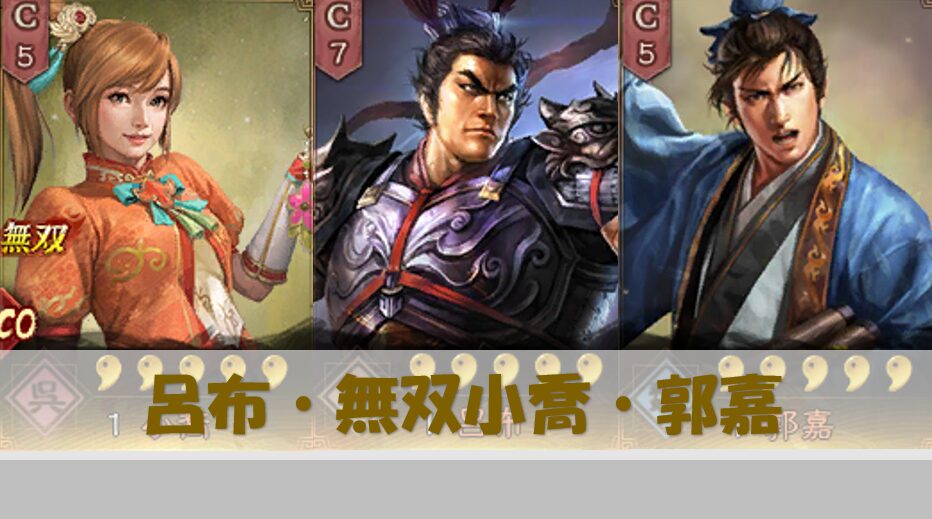 呂布を主将に、郭嘉と無双小喬を副将にした弓の三勢陣編制が流行っています。