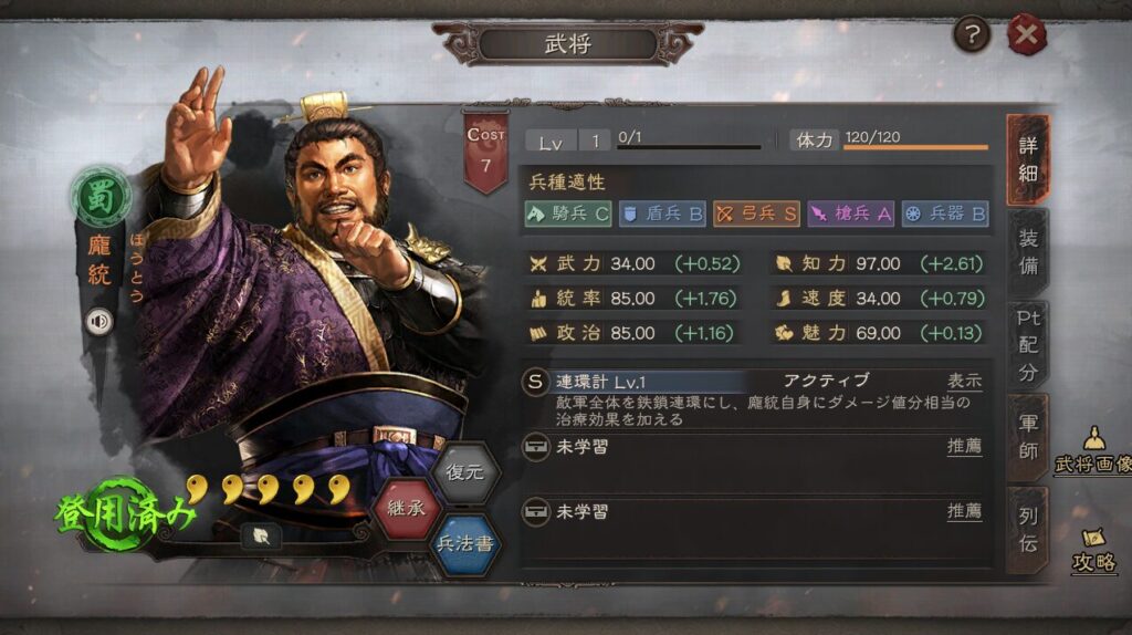 兵種適性は弓兵がS槍兵がAで、コスト7と重たい武将となっています。