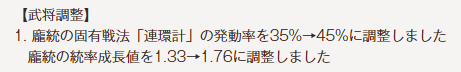 統率に関しては2025年12月24日のアップデートで、伸び率が1.33→1.76と上方修正され、レベル50時で比較すると150.17→171.24と約21上がっています。