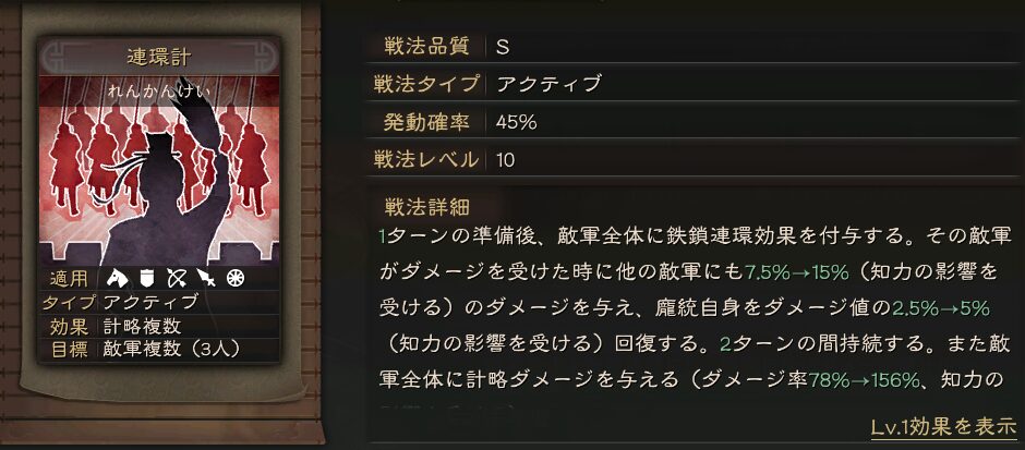 固有戦法の連環計は強力な代わりに発動確率が非常に低い戦法です。