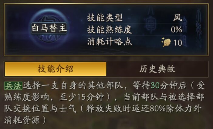 兵法: 自分の他の部隊を1つ選択し、30分後(熟練度の影響で最低15分)に、現在の部隊と選択した部隊が位置と士気を交換します(発動に失敗した場合、体力以外の消費資源の80%が返還される)