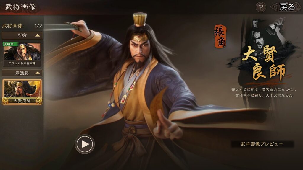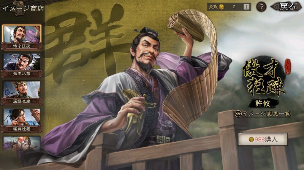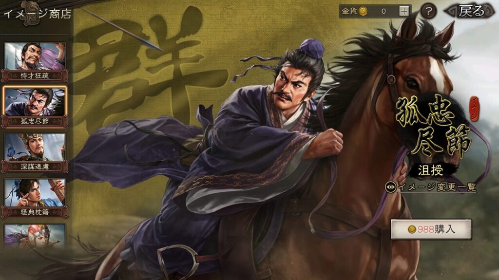 武将イメージとは、金貨(金銖ではない)を使用して入手する事ができる、いわゆるスキンアイテムです。購入しても能力値が上がったり戦闘で有利になるような事はありませんが、見た目が変わる気分的なアイテムになります。