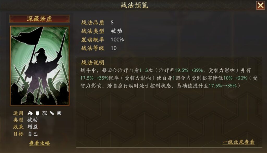 戦闘中、毎ターン自身を1~3回回復する(回復率19.5%→39%、知力の影響を受ける)。さらに、17.5%~35%の確率(知力の影響を受ける)で、自身が1ターンの間に受けるダメージを10%~20%軽減(知力の影響を受ける。自身が行動時に制御状態である場合、この確率の基礎値が17.5%→35%に上昇する。)